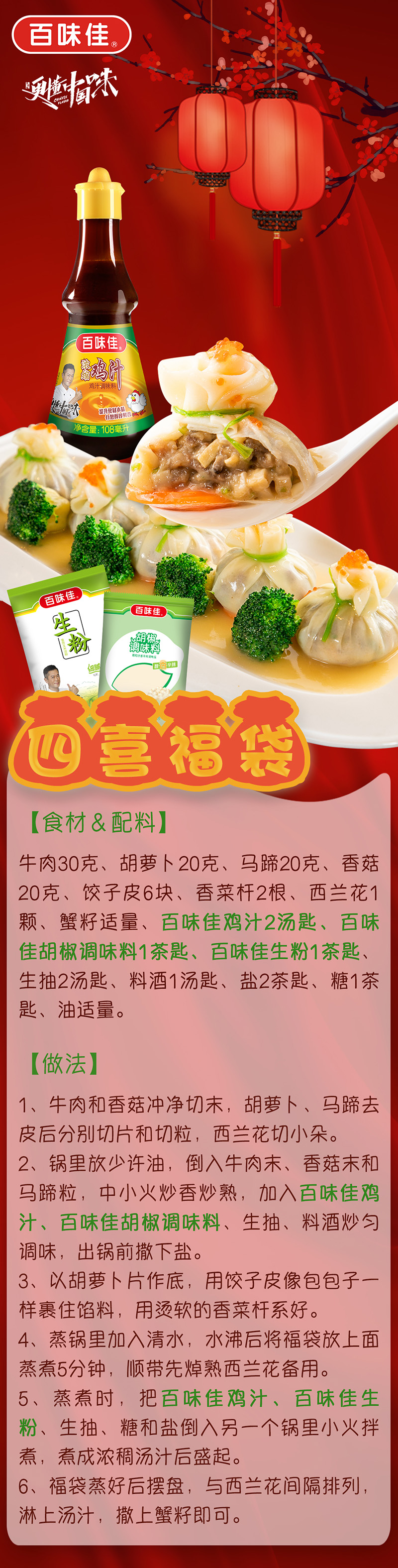 元宵節(jié)菜譜四喜福袋(應(yīng)用百味佳雞汁、生粉、胡椒調(diào)味料) 發(fā)布時間:2022-2-18 9:15:34 相關(guān)閱讀: 元宵節(jié)菜譜四喜福袋(應(yīng)用百味佳雞汁、生粉、胡椒調(diào)味料) 七夕味覺“食”刻,用百味佳醬料點燃浪漫餐桌!2025/09/03 秋日貼膘季|用酸甜橙香與醇厚醬香,解鎖初秋味覺新體驗!2025/09/03 新品上市 百味佳焙煎芝麻口味沙拉汁,為輕食簡餐添好味!2025/09/03 情暖八一 百味佳攜手共赴一場老兵之約,以公益之心傳承紅色軍魂2025/09/03 重磅官宣,佳哥表情包全新上線啦,快來一起聊天吧!2025/09/03